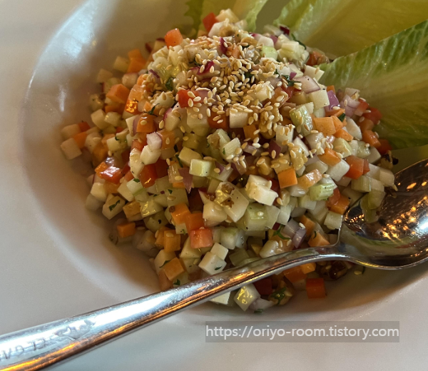 스프링 샐러드는 야채가 이렇게 잘게 컷팅되어 나오는 샐러드는 처음이라 독특했다. 숟가락으로 퍼먹기에 딱이었다.