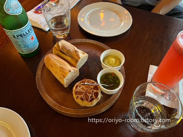 식전빵이 나오는데, 따듯해서 버터 발라 먹기 좋다. 빵 보다 더 맛있었던 건 저 마늘 구이.. 진짜 맛있었다. 마늘을 통째로 위아래만 잘라내고 살짝만 조미해서 오븐에 구운 것 같은데, 사진 보니 어떻게 굽는건지 찾아보고 따라 해야겠다.