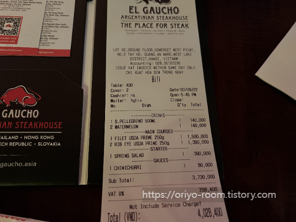 총금액은 4,028,400 VDN이다. 총금액에 부가세가 따로 8%가 붙는다. 한화로 22만 원이 넘는 금액. 베트남 물가로 2명이서 이 정도 먹은 가격이면 매우 비싼 편이다. 앗 근데 그러고 보니 지미추리 소스가 유료로 8만 동이 추가됐네! 이제 봤다. 소스 주문을 받더라니..... 저거 맛도 없는지 기억에도 안 남는데.. 아무튼 너무 뒤늦게 봤으니 패스해야겠다.