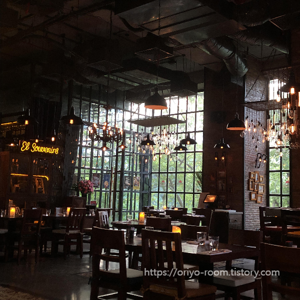 실내는 꽤 넓다. 단체석도 여럿을 받을 수 있을 정도의 규모이다. 실내 인테리어는 각종 전구가 믹스되어 디스플레이가 되어 있는 것이 특징으로 어둑한 분위기이지만 전구가 그 분위기를 적당히 다듬어주는 듯하다. 해가 지기 전에 도착해서 그런가 큰 창문으로 보이는 푸릇한 풍경까지 어우러져 매력적이었다.