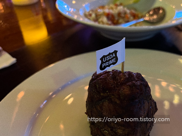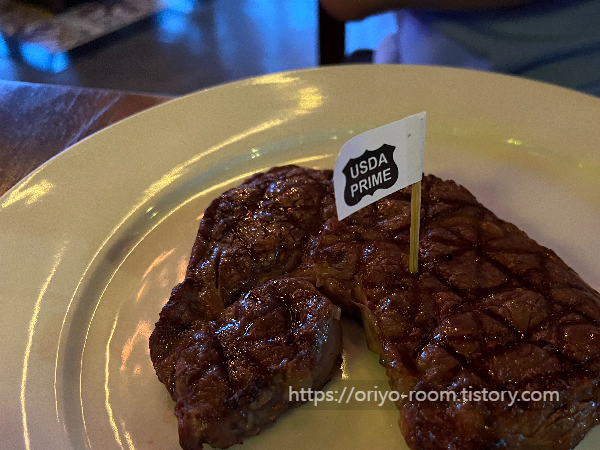 이 사진이 필렛 250g이다. 사진으로 보니 무슨 진흙덩어리 같다. 사실 이건 도전하느라 고른 메뉴인데, 립아이에 비해 육질이 더 씹히는 편이라 내 입맛에는 립아이가 훨씬 더 맛있었다.