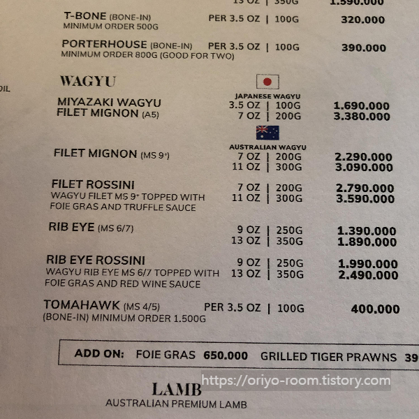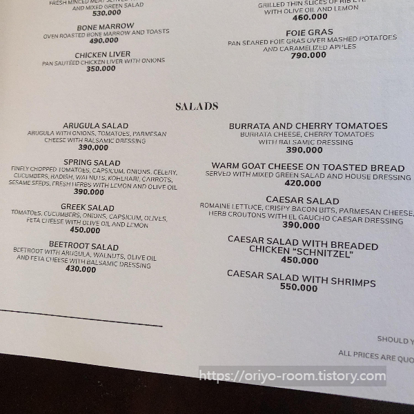 일단 샐러드를 골라보았다. 가격은 39만동~55만동까지 구성되어 있다. 가격대가 일단 샐러드부터 높은 편이다. 와규는 일본산/호주산으로 구분되어 있고, 고기는 그람 수에 따라 가격이 다르기 때문에 잘 따져보는 것이 좋다. 주문은 스프링 샐러드, 필렛 250g, 립아이 250g, 수박주스, 스파클링 워터를 골랐다.