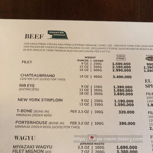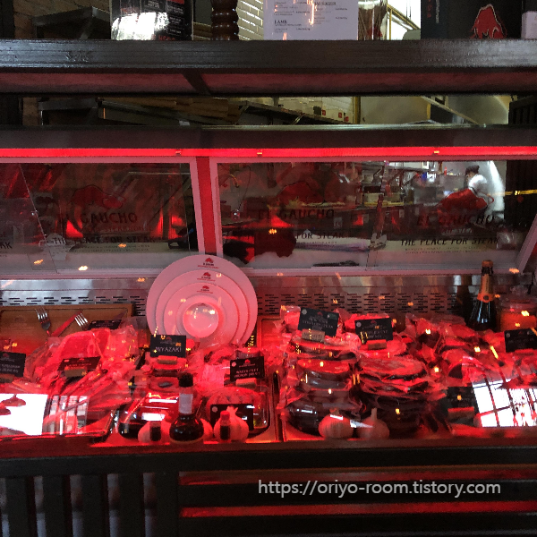 스테이크는 한쪽 냉장고에 깔끔히 패킹되어 보관중이었다. 저 안에 내가 먹을 스테이크도 있겠지.. 하며 두근거리는 마음으로 엘 가우초 메뉴판을 찾아보았다.